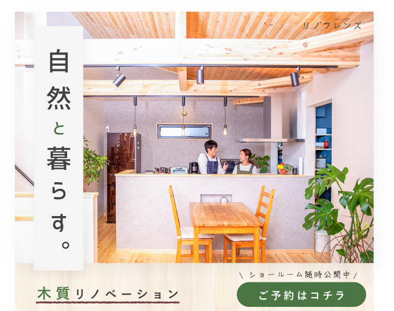 植物を感じる、緑をアクセントとした配色や、木目のビジュアルを取り入れて、ナチュラル感を演出しました。また全体的にトーンを明るめにし、リノベーションした家で楽しそうに暮らしている夫婦のビジュアルと合わせてコピーの「自然と暮らす」なことを素晴らしさを訴求できるデザインに仕上げました。
